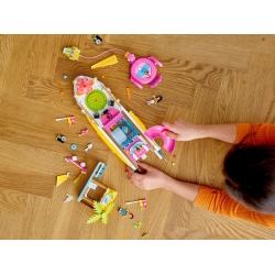 • Dzieci mogą odgrywać role postaci z LEGO® Friends — Andrei, Emmy lub Ethana — i pływać łodzią imprezową lub wygrzewać się na pokładzie. Mogą też bawić się flamingiem, obsługiwać klientów plażowej wypożyczalni sprzętu albo szaleć na skuterze wodnym.