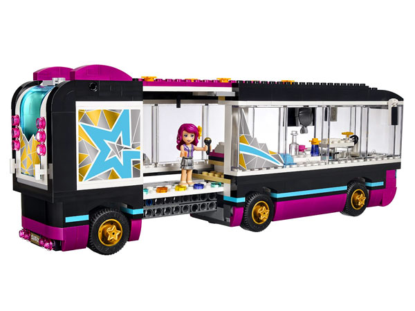 Lego Friends Wóz Koncertowy Gwiazdy Pop 41106. Pojedź z gwiazdą popu Livi jej wspaniałym wozem koncertowym! Wóz koncertowy służy Livi za dom, gdy jest ona w trasie. Ma wszystko, czego potrzebuje gwiazda popu, aby odpocząć i przygotować się do występu. Odpocznij w salonie i pomóż Livi przeczytać listy od fanów, a potem baw się dobrze, śpiewając karaoke ze Stephanie i Mią. Zatrzymaj wóz i odsłoń scenę do prób, na której Livi będzie przygotowywać się do dzisiejszego przedstawienia. Jej przyjaciółki mogą się jej przyglądać z ustawionych pod parasolem leżaków, z napojami i przekąskami. Po próbie włącz muzykę z konsoli didżejskiej, przy której Livi będzie bawić się wraz z przyjaciółkami. Następnie odpocznij w gorącej kąpieli, gdy Stephanie przejmie kierownicę i zawiezie Livi na wielkie przedstawienie! W zestawie znajdują się 3 minilaleczki: gwiazda popu Livi, Stephanie i Mia.